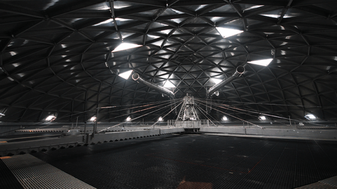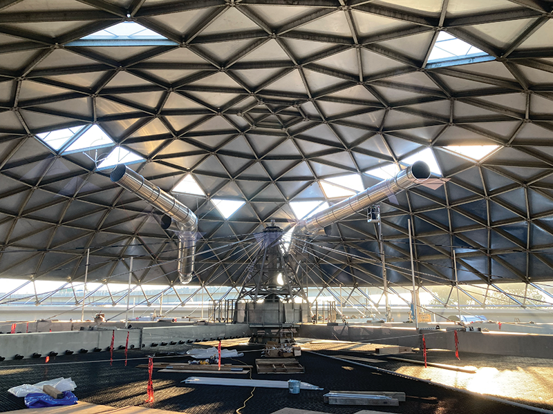 To overcome these obstacles, Crosstown’s team provided CAD drawings for the entire ventilation system. “This allowed us to layout and install the hanger system when the geodesic dome was on the ground while having an unobstructed area to work with,” Kisser says. “Having this done earlier in the schedule also lessened the ducting installation time once the dome was reattached to the tanks.”