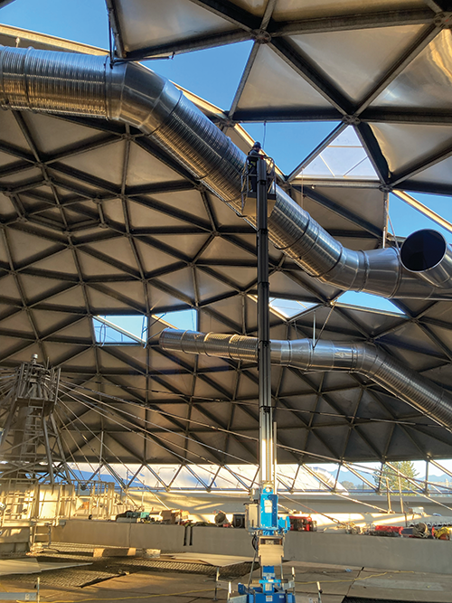 The next challenge was the installation. “We initially thought we’d need scaffolding, but ended up using lightweight Genie lifts instead,” Kisser says. “The filter media inside the trickling filter couldn’t support heavy equipment, so the general contractor built a plywood floor over the filter media, allowing us to use smaller 45-foot man bucket lifts to install the ductwork.”